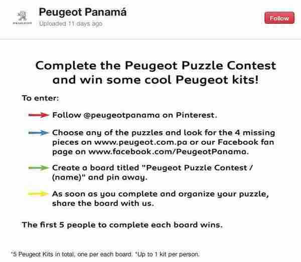 Peugeot通过这个拼图的活动,激励用户去他们的官方主页与Facebook企业页面上去寻找碎片的图片,利用Pin(采取图片),用户们可以在pinterest完成拼图。最先完成拼图的五个人可以获得奖品。