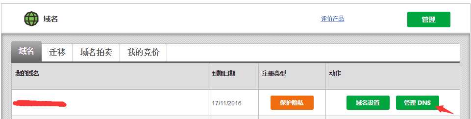 1. 登录到GoDaddy后台,在域名列表中找到想要做别名解析的域名,点击后面的绿色“管理DNS”按钮进入。