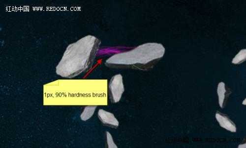 效果图非常有创意,用到的素材也非常简单,一些石块素材而已。制作的时候只需要把石块抠出来,适当变形并排成想要的文字,然后用画笔画一些光丝,用滤镜处理成艺术效果,后期再调色即可。