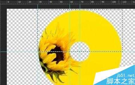 点击“椭圆选框”工具,按“Shift+Alt”键,在辅助线交汇点按下鼠标左键并拖拽绘制出如图所示选区,按“Delete”键,删除选区图像