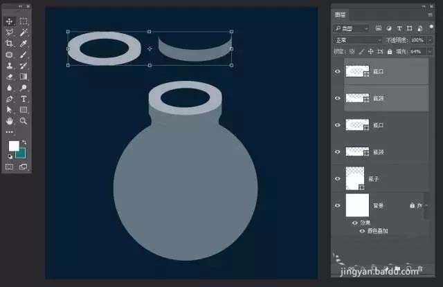 6、到这里,瓶子的身体部分的外形就做好了,利用钢笔工具把瓶口与瓶颈边缘描出来,最后组合在一起
