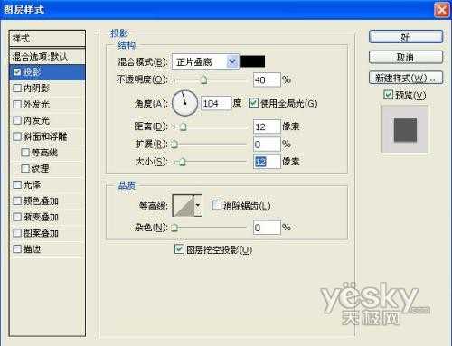 3、双击图层1,在打开的图层样式对话框中分别勾选“投影”和“渐变叠加”图层样式,设置各项参数如图03和04所示。