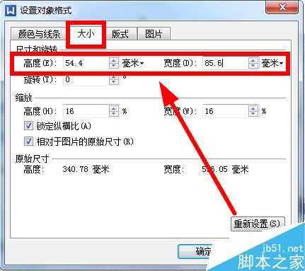 双击图片,打开图片编辑对话框,选择大小,然后我们设置图片的宽度与高度,如下图所示: