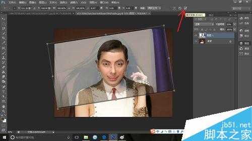 旋转上方图层使两张图片的眼睛相对。按enter键或者点击选项栏上的对号提交变换。