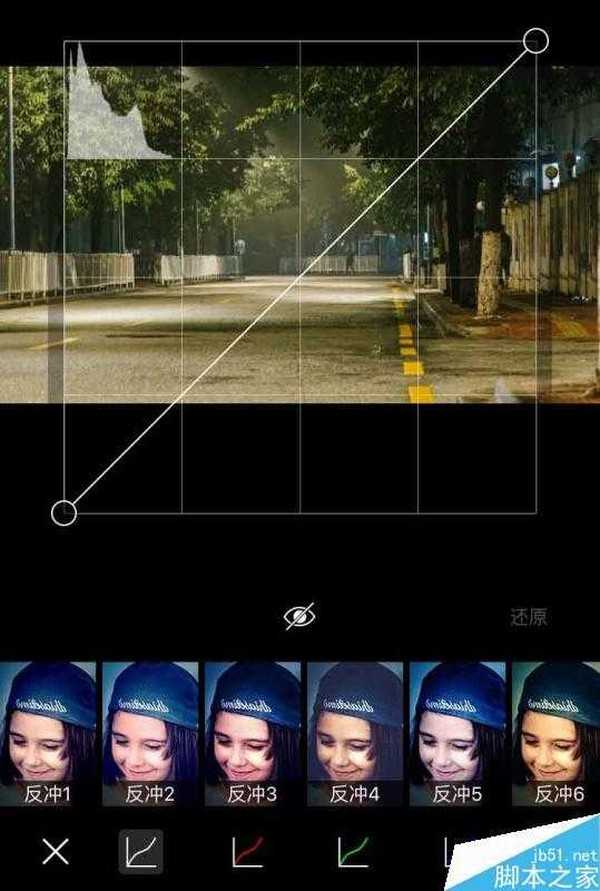 调节曲线后背景的照片可以实时预览,这点还是不错的,十六宫格左上角有个色阶图简单提示了图片的信息,这里我不做详细展开,只简单介绍下,色阶左侧是黑(暗)右侧是白,一张曝光均衡的照片它的色阶应该是比较均匀的,如果画面欠曝,或者出现死黑现象,色阶的左侧就会很多或溢出,反之如果过曝,色阶右侧就会就较多信息。