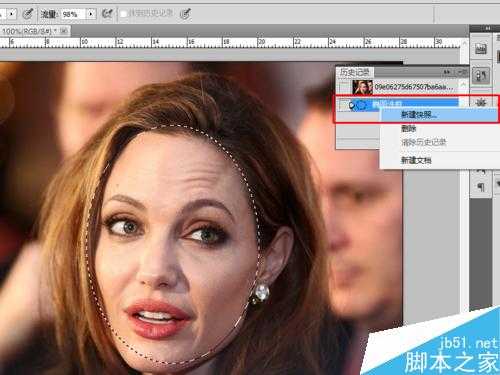 15、在左侧工具栏中将矩形选择框换为椭圆选择框,然后大概把人脸或者说你要去皱的部分盖住(盖多不盖少),有人说这怎么能刚好拉住啊起点很难找,那么拉的时候按住空格试一下。然后在右侧点开返回上一步的菜单栏,在椭圆选框处右键点击新建快照!具体位置如图