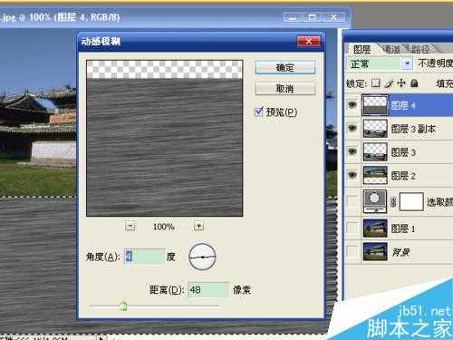 6、执行动感模糊,角度4、距离48,确定。所有的参数可以随意一些,根据需要进行设置。
