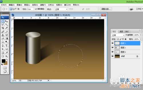 8、我们再来跟圆柱体加一个阴影,使其更逼真。选择多边形套锁,画一个矩形,大概阴影大小就可以。对其进行,选择—修改—羽化,羽化3个像素作用。(上面图形为未羽化的图形,下面图形为羽化3像素的图形,边缘较圆滑。)