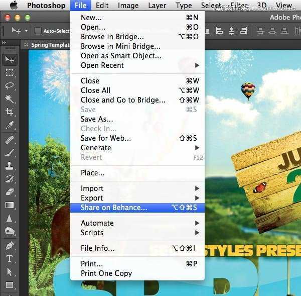 Behance是创意云服务集合的一个伟大的附加项。只需拥有一个账号,即可将你的任何作品从Photoshop导入你在Behance的账号中。因为我经常要用到这个选项,因此我为其设置了一个类似于将文件保存到桌面的快捷键Command/Ctrl + Alt + Shift + S,你可以随时将你的工作上传到Behance上,同样也可以随时重新上传。这将大大加速你和客户之间的修订过程。