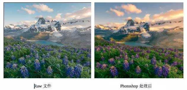 在这里简单说一下我这张图的后期处理思路。这张片子的光线是从画面右边的太阳照射过来,当时还有些云稍微挡住了太阳光的照射,所以前景的花并没有被直射光照射到,只有映射光。整张片子的主体是这花海还有背景太阳光照射下的雪山和冰川。在处理这张片子当时我马上就判断了背景的雪山和冰川肯定是拥有高饱和度和亮度的颜色因为被直射光照射到(直射光区域),其次是拥有映射光的前景花海(映射光区域),最后就是画面中没有被光照到的暗处(无光区域)。
