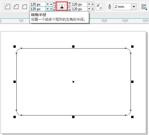 2. 在矩形被选中的状态下,选择属性栏设置圆角弧度,将“同时编辑所有角”的小锁按钮进行锁定,输入“转角半径”数值,得到四角同时编辑效果。