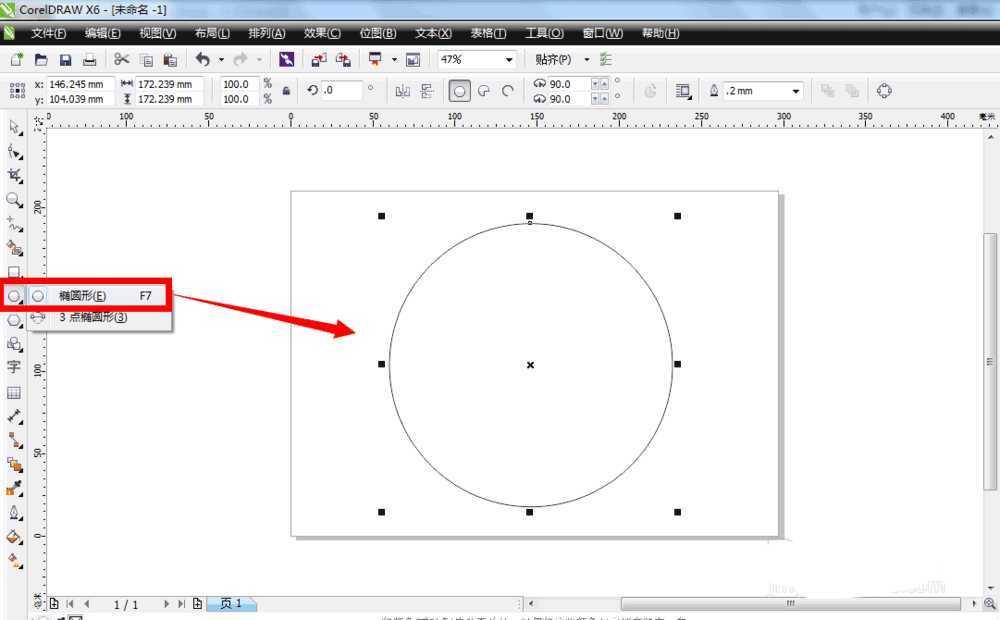 1、在cdr软件左侧的工具栏里面选择椭圆形工具,按住键盘上的ctrl键,在页面上绘制一个大圆
