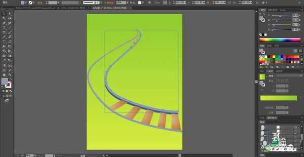 2、用钢笔在背景上绘制从左到右的铁轨的路径,我们用青色填充这两根铁轨,暗光区域用蓝黑色填充,对于轨道上面的木枕用土黄色的渐变填充。我们在暗光区域用暗棕色填充。