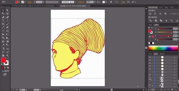 3、我们用黄色填充整个人物的剪影路径,再用红色填充人物的眼晴、头部的阴影等元素的路径,让黄色与红色搭配出现在人物的头像上面。