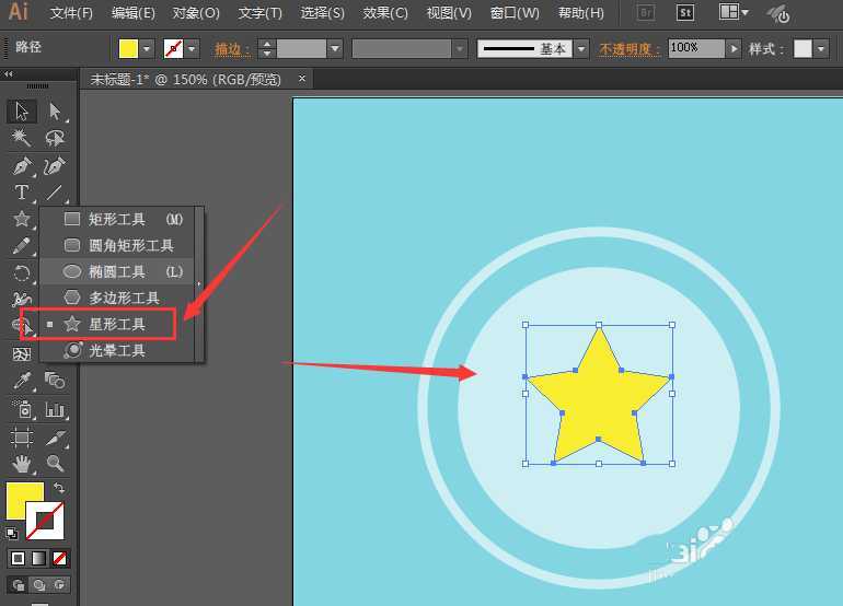 4、然后,开始在中间绘制星形了,利用星形工具做,然后填充一个黄色