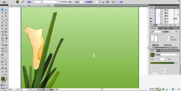 5、绘制更多的新的枝条,我们通过改变枝条亮区的透明度与填充不同色调的绿色渐变来实现同一根枝条上面的色调的变化效果。