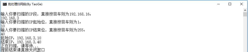 1、双击运行批处理文件,会弹出一个命令窗口,要求输入IP段,如果不输入,直接按回车的话,则默认为192.168.16段。