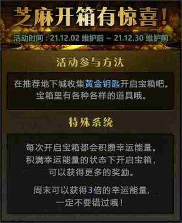 DNF芝麻开箱有惊喜活动于12月2日维护更新后上线,该活动每天有一次免费开启宝箱的机会,除此之外,还可以在推荐地下城中击杀怪物获得黄金钥匙,每一把黄金钥匙都可以开启一次宝箱,黄金钥匙每天上限获得20把。