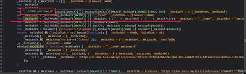 let _0x5f84aa = "https://c.dun.163.com/api/v3/check" _0x5f84aa += (~_0x5f84aa.indexOf('?') ? '&' : '?') + _0x31e743(senObj) + '&' + 'callback' + '=' + callback _0x5f84aa = _0x5f84aa['replace']('?&', '?') var _0x4b24f9 = document['getElementsByTagName']('script')[0x0] || document['head']; _0x5f84aa['replace']('?&', '?') let _0x541624 = document.createElement('script') _0x541624['type'] = 'text/javascript' _0x541624['src'] = _0x5f84aa _0x4b24f9['parentNode']['insertBefore'](_0x541624, _0x4b24f9) _0x30c635;