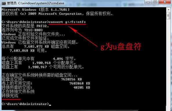 2、在打开cmd dos命令窗口中光标处输入“convert g: /fs:ntfs”按回车键执行命令,等待完成转化NTFS格式即可,这里g为当前电脑中u盘盘符,如下图所示: