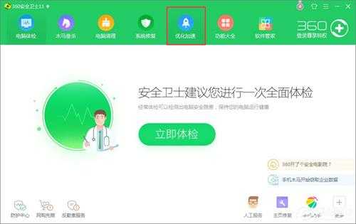 1、打开360安全卫士,点击主菜单中的优化加速选项;