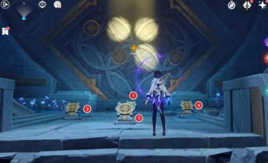 按照以下步骤操作:先将机关中的数字③旋转一次,然后将数字④旋转一次,最后将数字①旋转一次,即可开启前方大门。